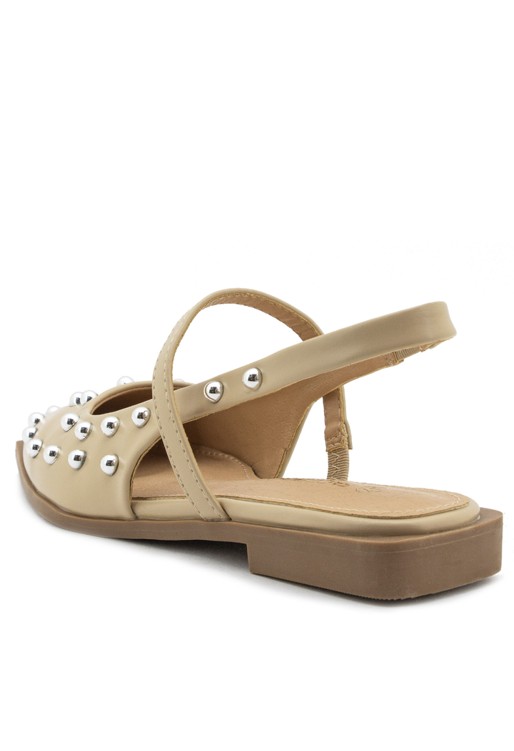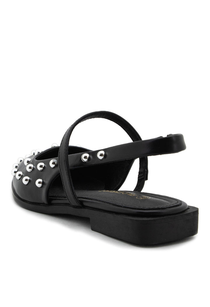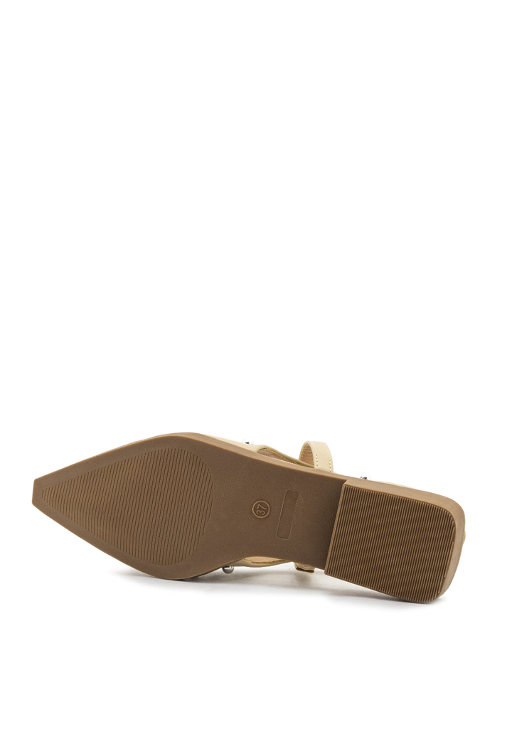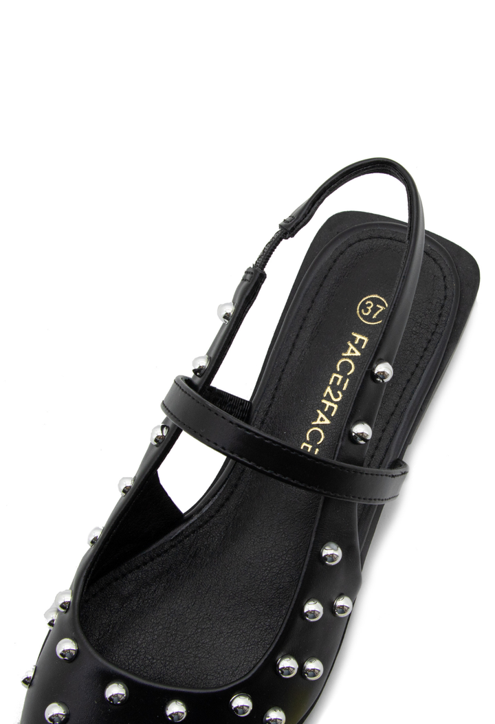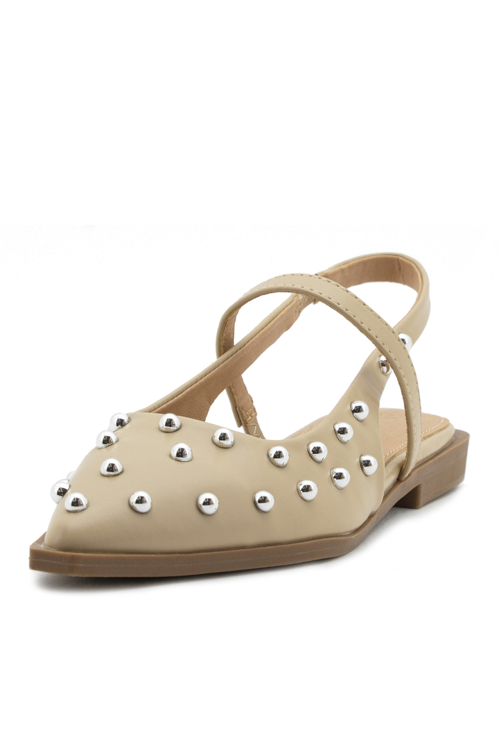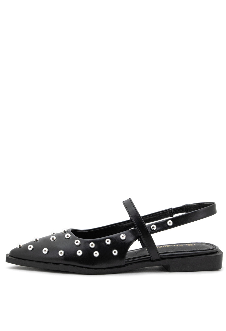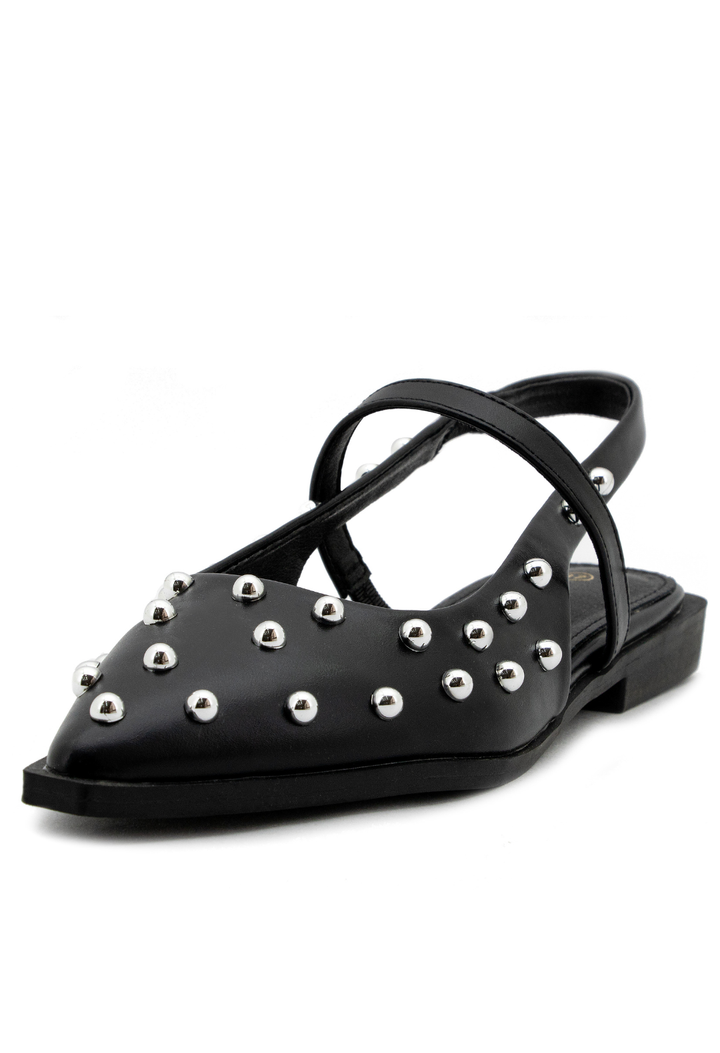 Baletas puntudas que combinan elegancia clásica con un toque contemporáneo. Diseñadas con puntera afilada para alargar la silueta y adornadas con taches mediabola que añaden sofisticación y personalidad. Perfectas para quienes buscan un calzado versátil que transita sin esfuerzo de la oficina a eventos especiales. Su construcción cuidadosa garantiza comodidad durante todo el día, mientras que los detalles metálicos capturan la luz con cada paso. Un imprescindible para el guardarropa de la mujer moderna.