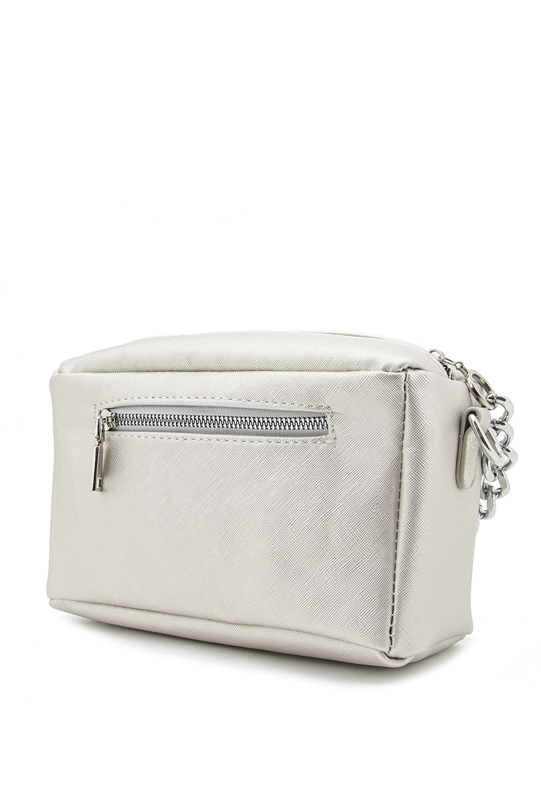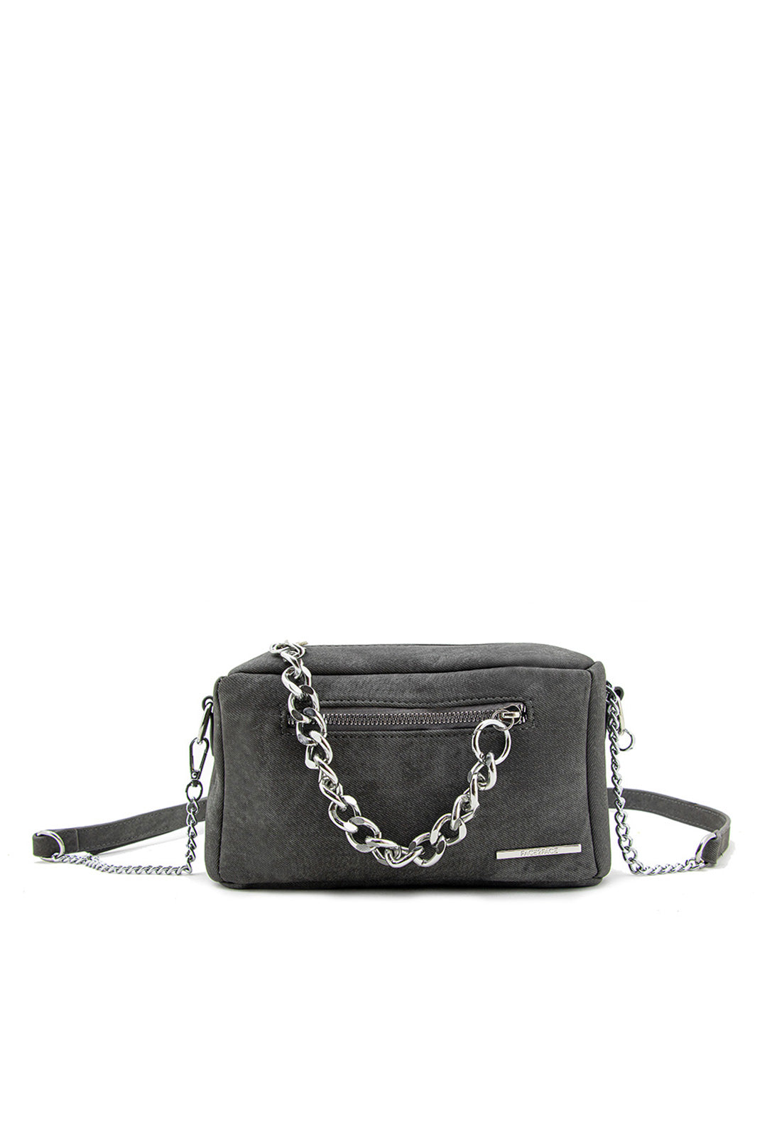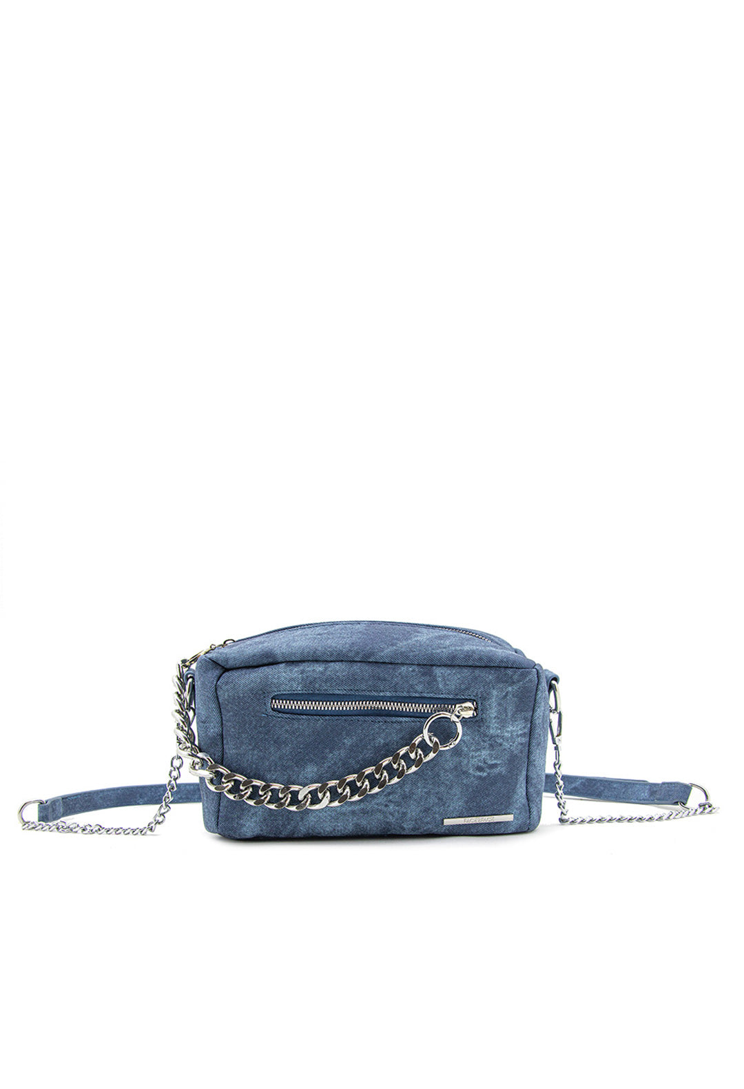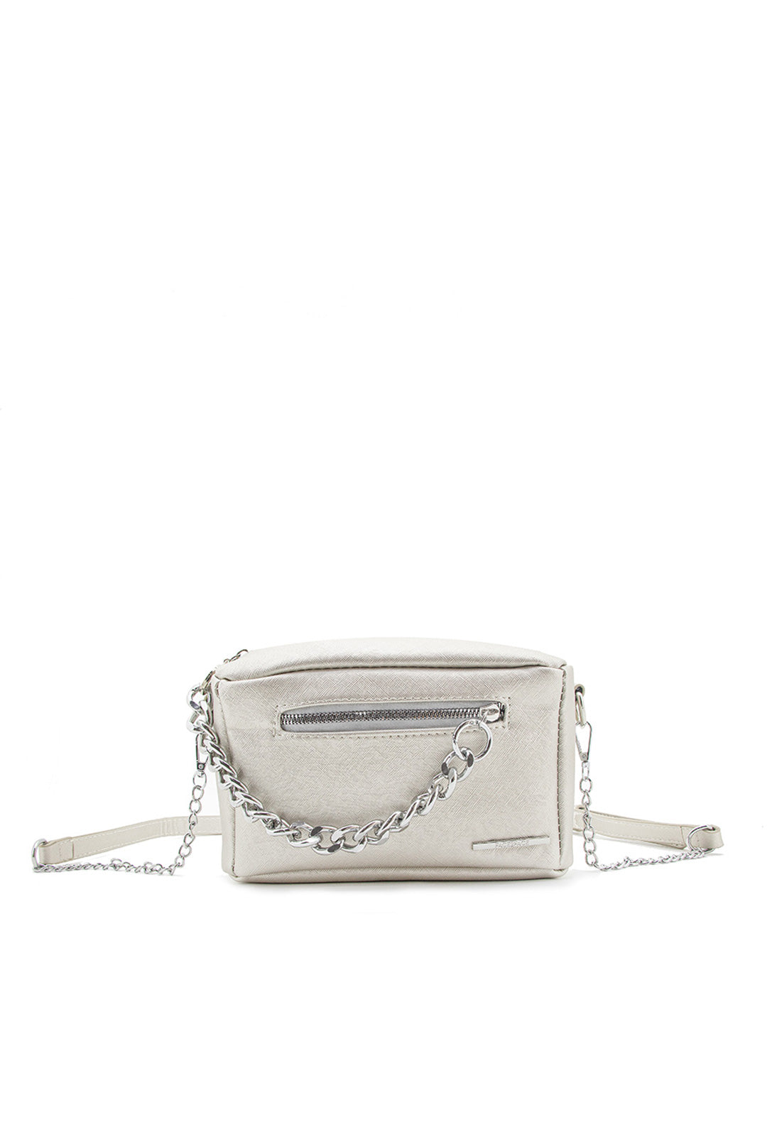 Bandolera rectangular con bolsillo delantero y cadena decorativa, bolsillo trasero con cierre y cargadera en sintético con cadena