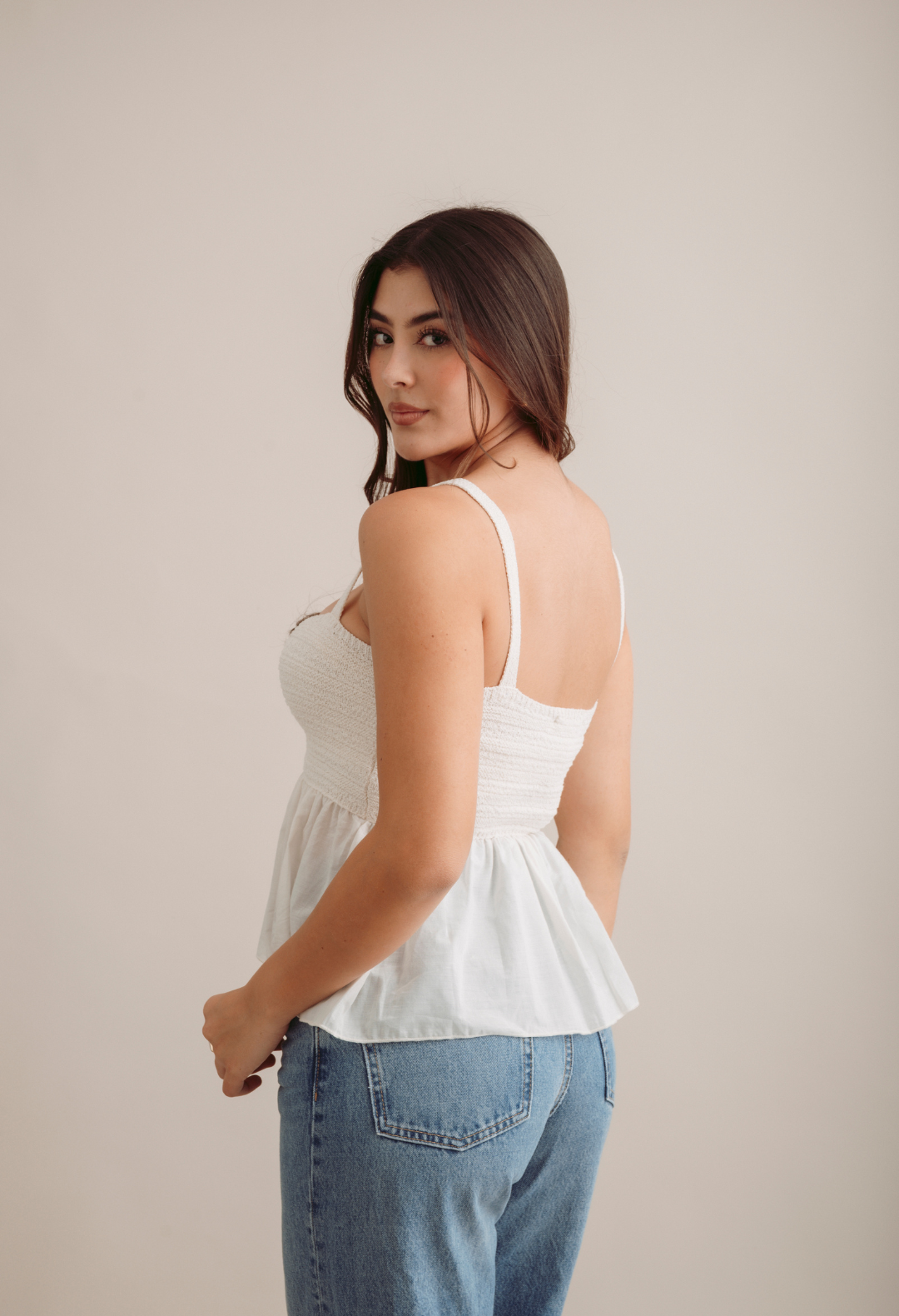 Esta blusa blanca de tirantes con vuelo ofrece un diseño delicado y elegante que realza tu feminidad con sutileza. Su corte fluido y ligero aporta movimiento y comodidad, ideal para looks sofisticados y frescos. Perfecta para combinar con accesorios minimalistas y crear un estilo refinado y moderno.