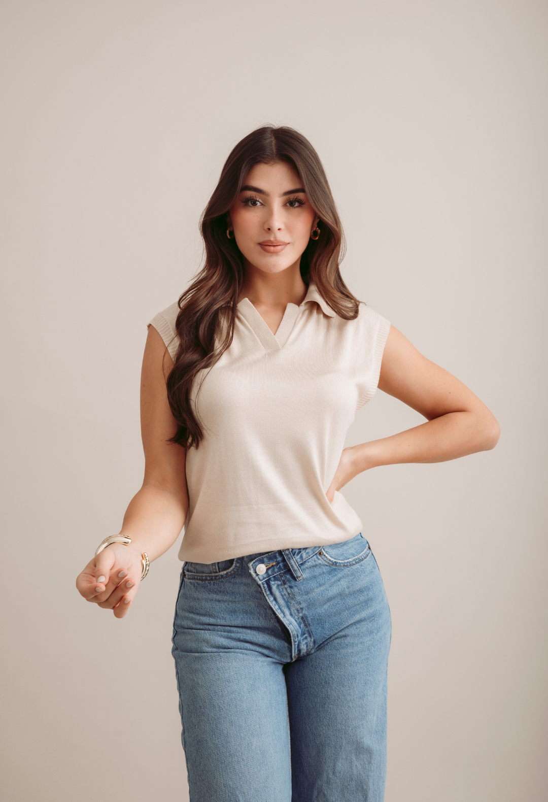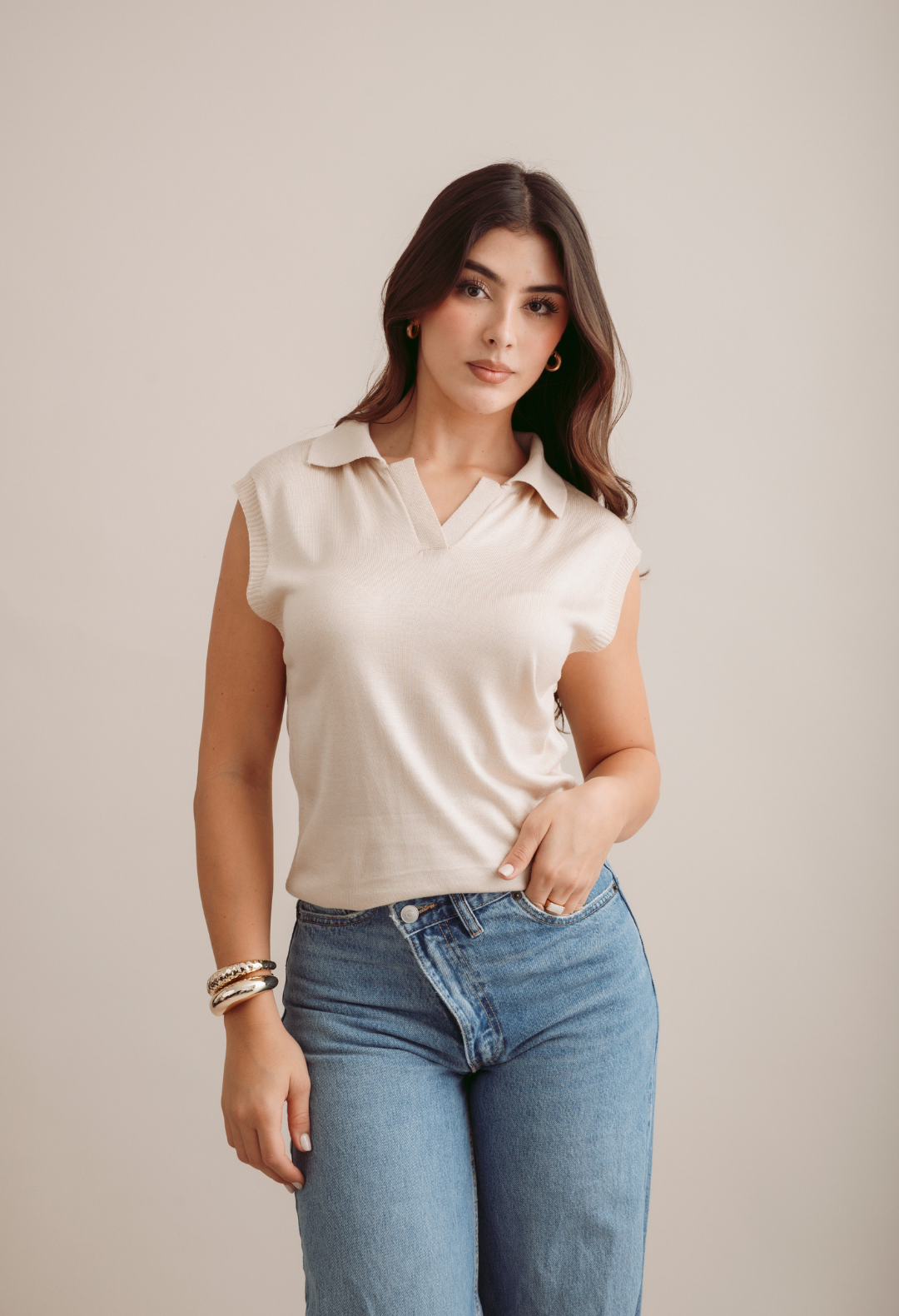 Esta blusa sin mangas con cuello ofrece un diseño elegante y sofisticado, ideal para eventos formales o reuniones de trabajo. Su corte delicado realza la figura, mientras que el cuello añade un toque de distinción. Perfecta para combinar con pantalones o faldas, brinda comodidad sin sacrificar estilo.
