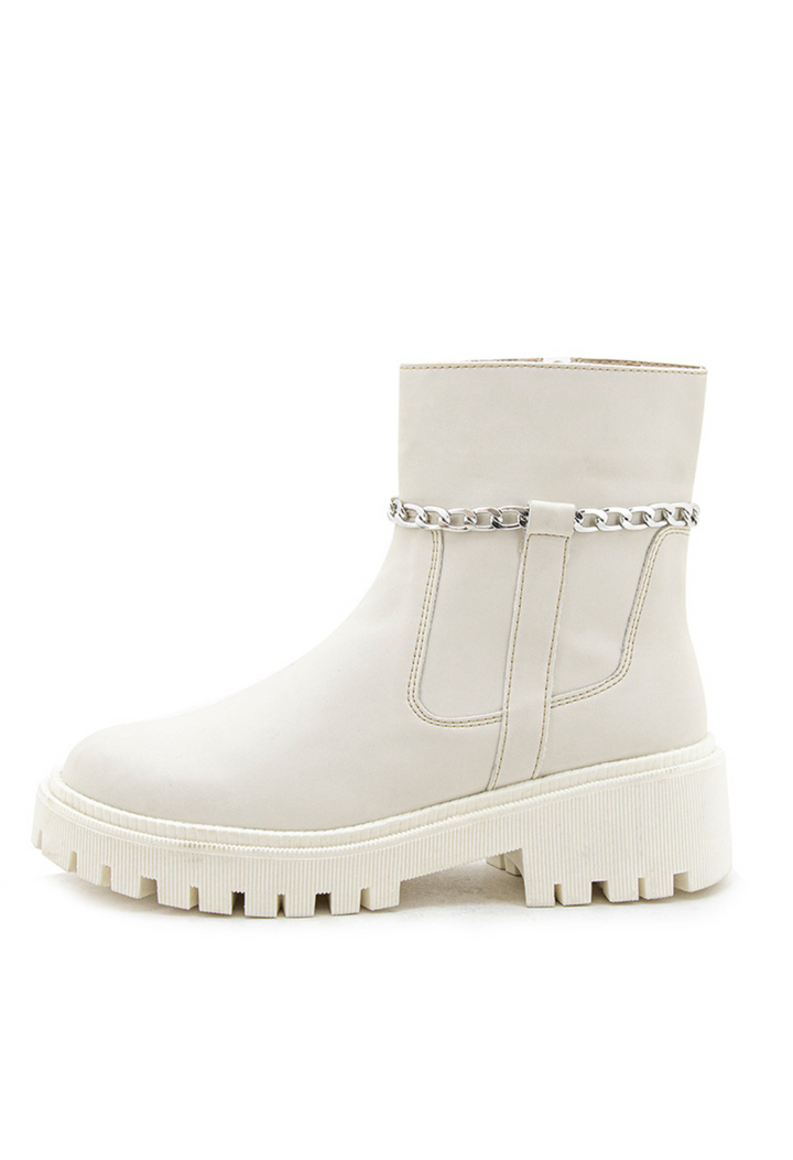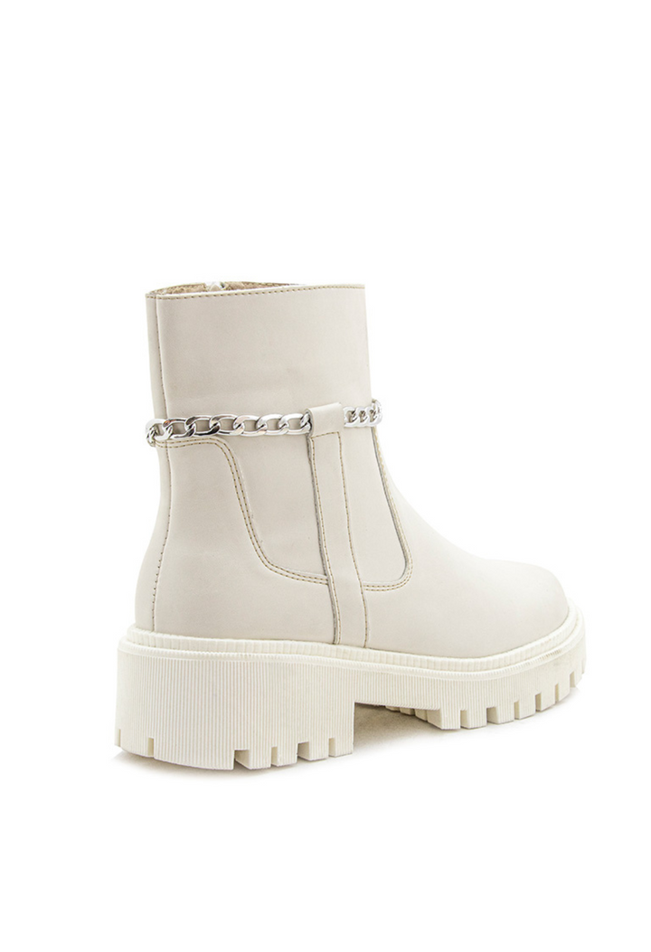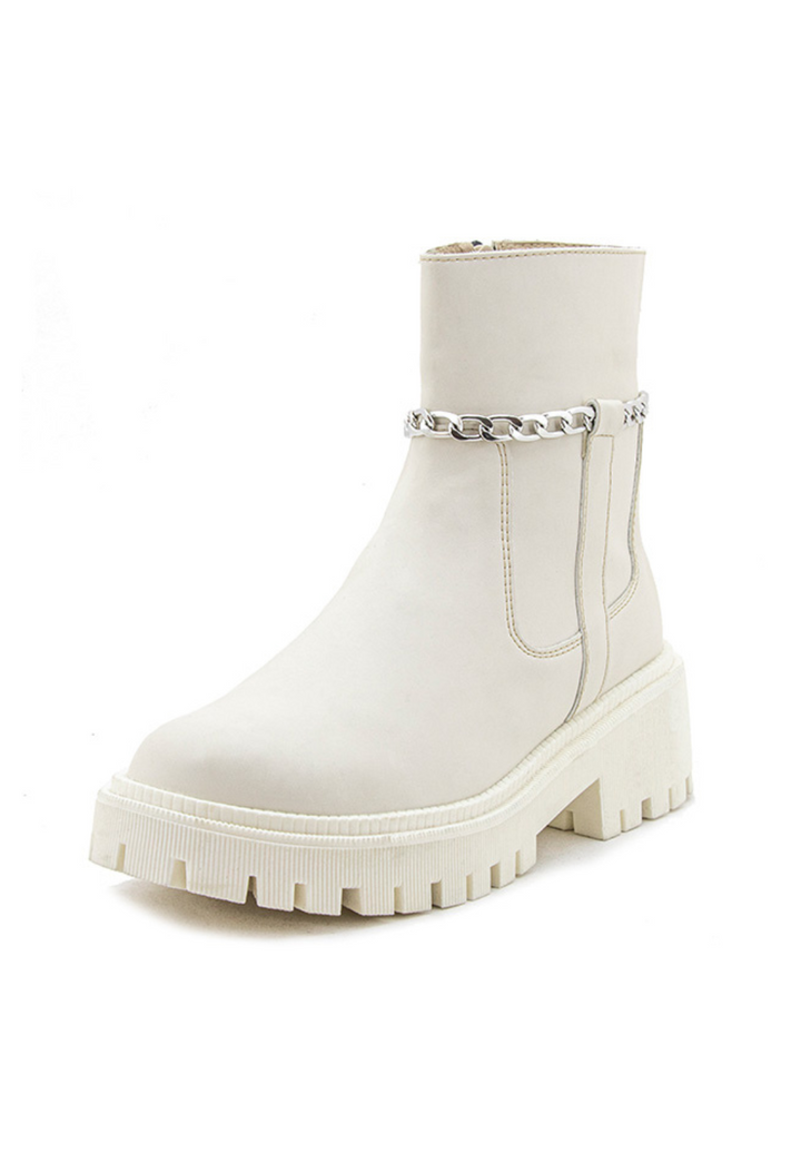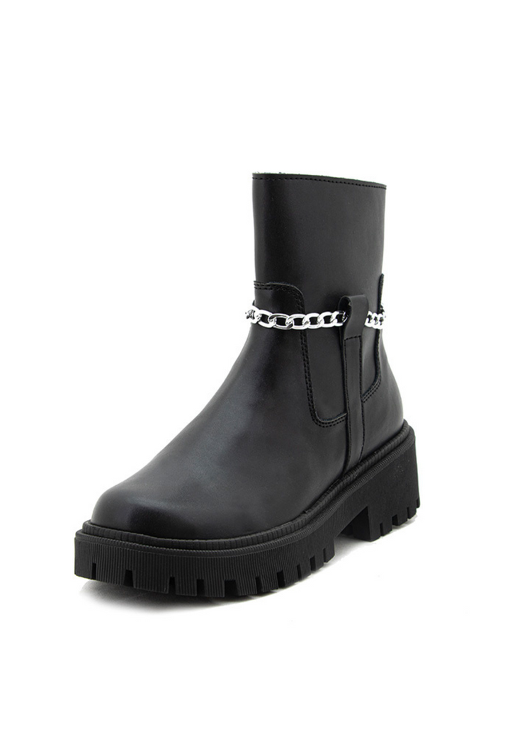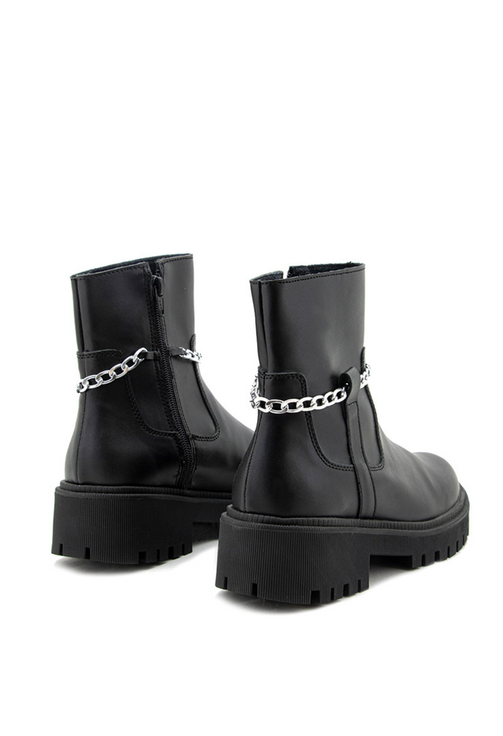 Este botín de caña media destaca por su diseño moderno con una cadena en el tobillo que aporta un toque audaz y sofisticado.