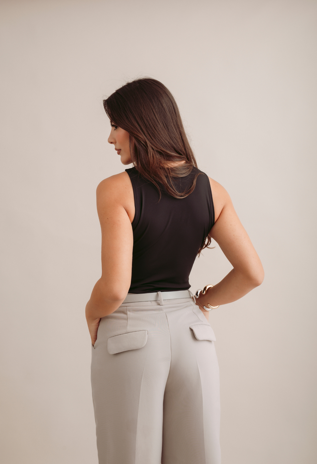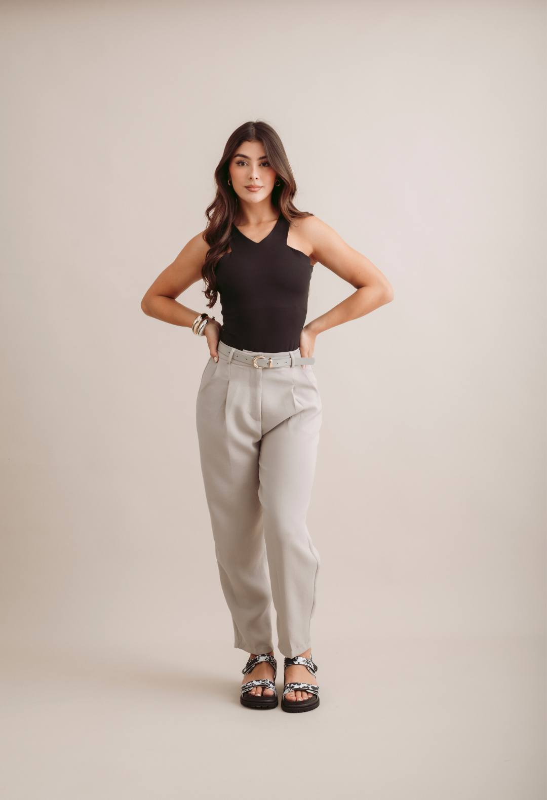 Este pantalón con pinzas frontales combina elegancia y comodidad, realzando la figura con un diseño impecable. Su ajuste favorecedor y detalles sutiles lo convierten en una prenda versátil para ocasiones formales o de trabajo, aportando un toque sofisticado a cualquier look.