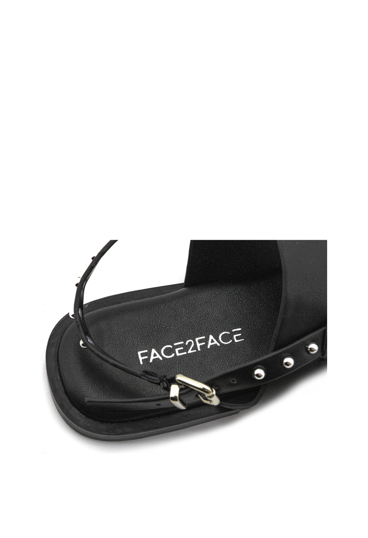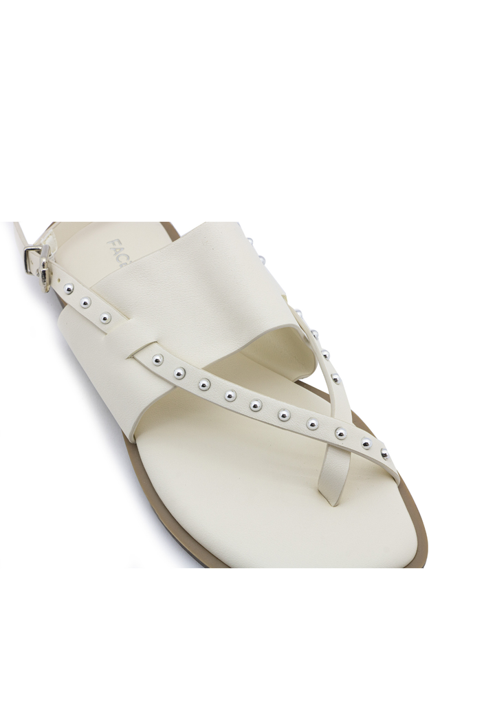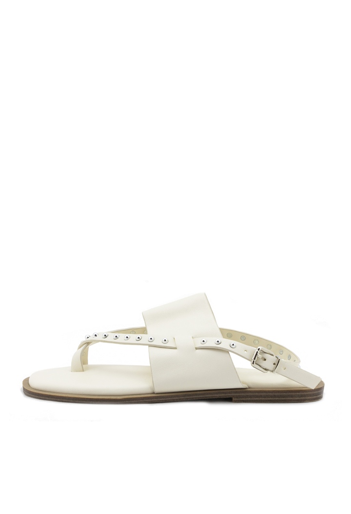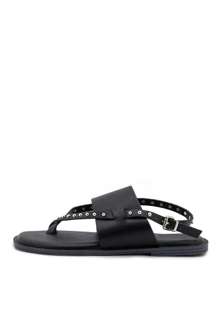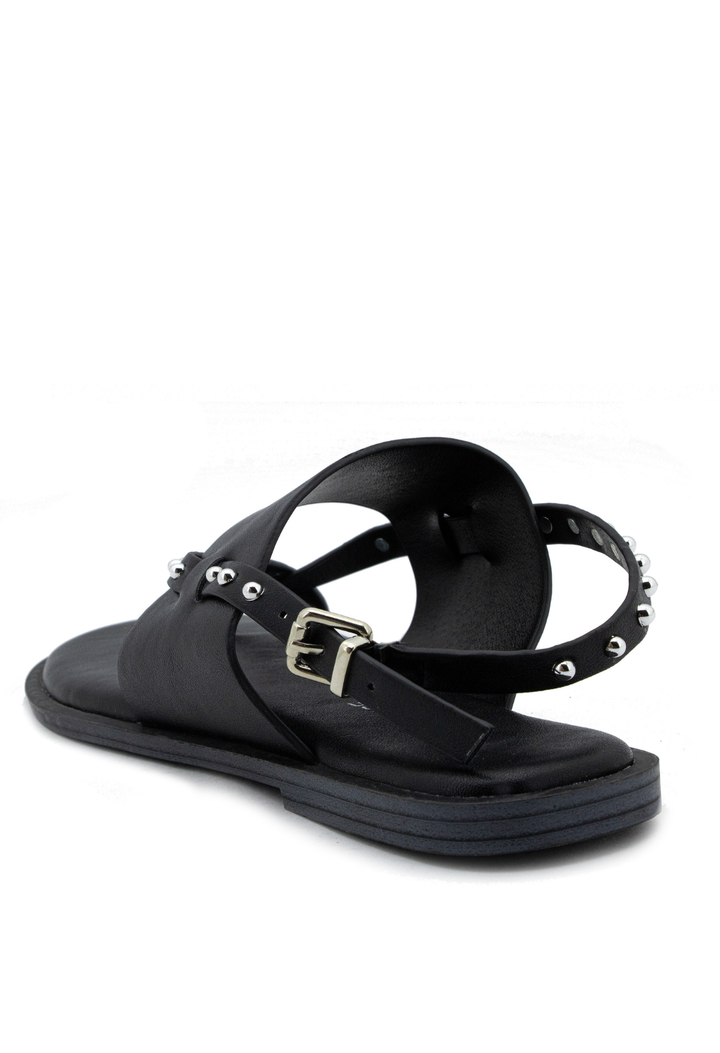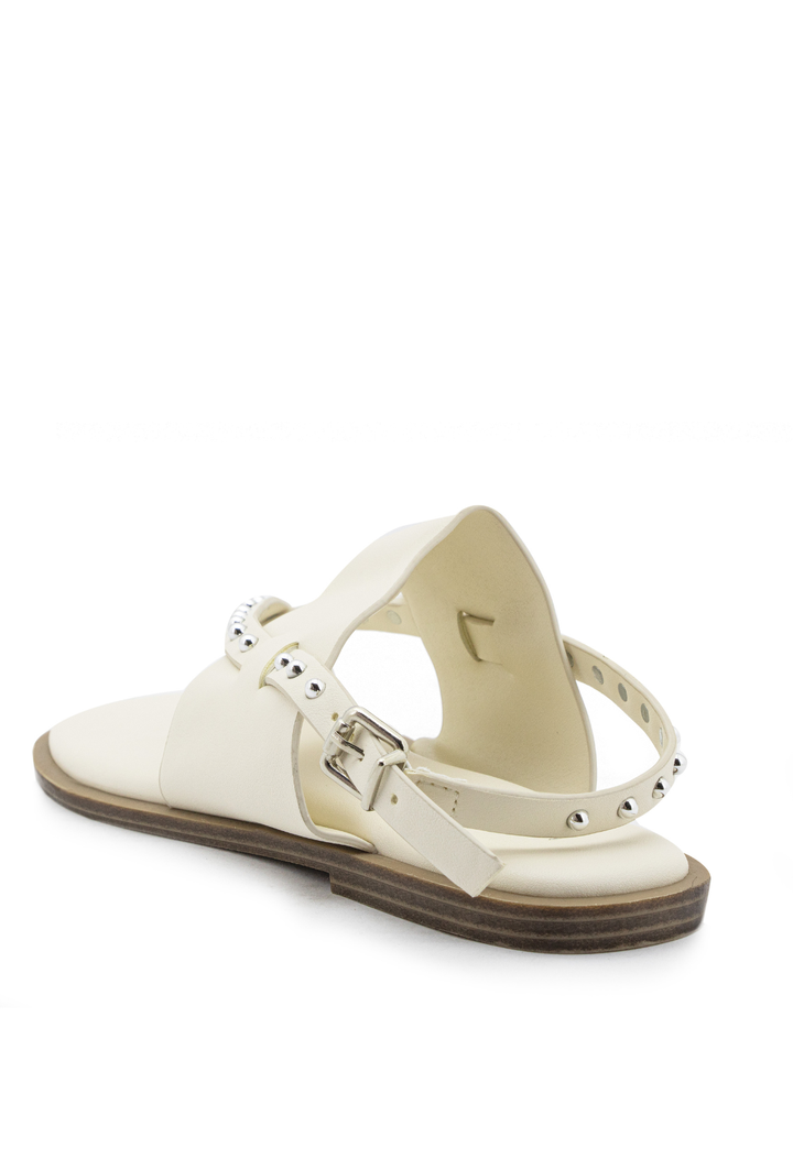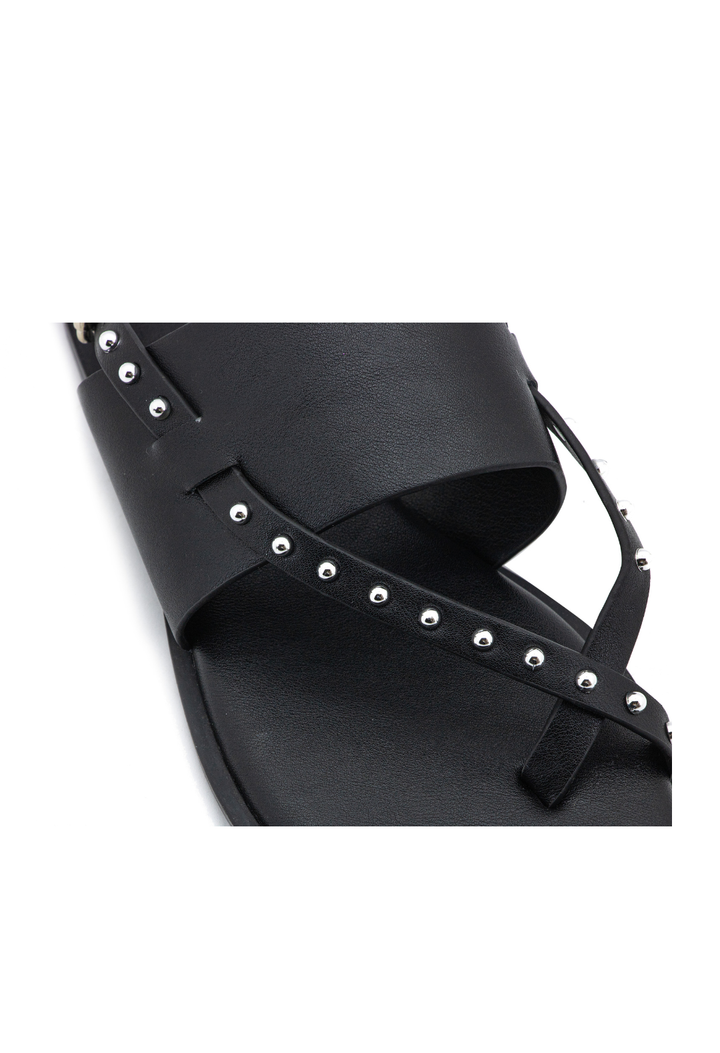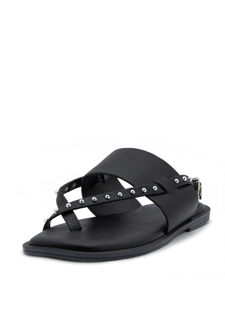 Esta sandalia plana combina elegancia y modernidad con su diseño de capellada adornada con taches en media bola, ofreciendo un toque de sofisticación sutil. Su estructura cómoda y plana permite un uso prolongado sin sacrificar estilo, ideal para quienes buscan un calzado versátil que complemente cualquier look con distinción. Perfecta para ocasiones informales y eventos diurnos donde la comodidad y el glamour se unen con armonía.