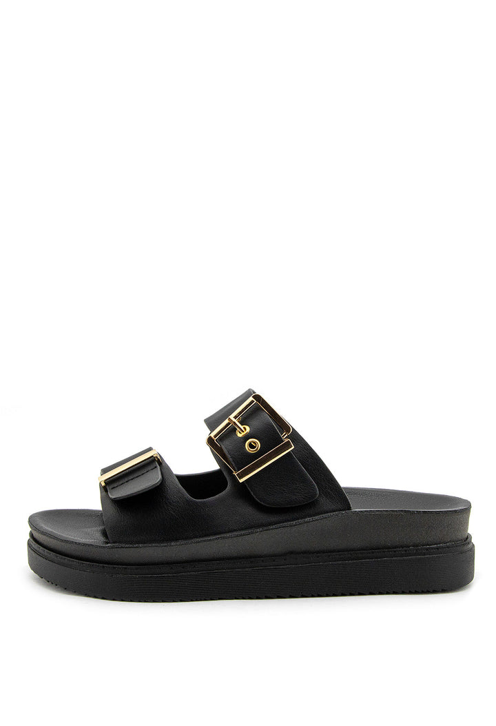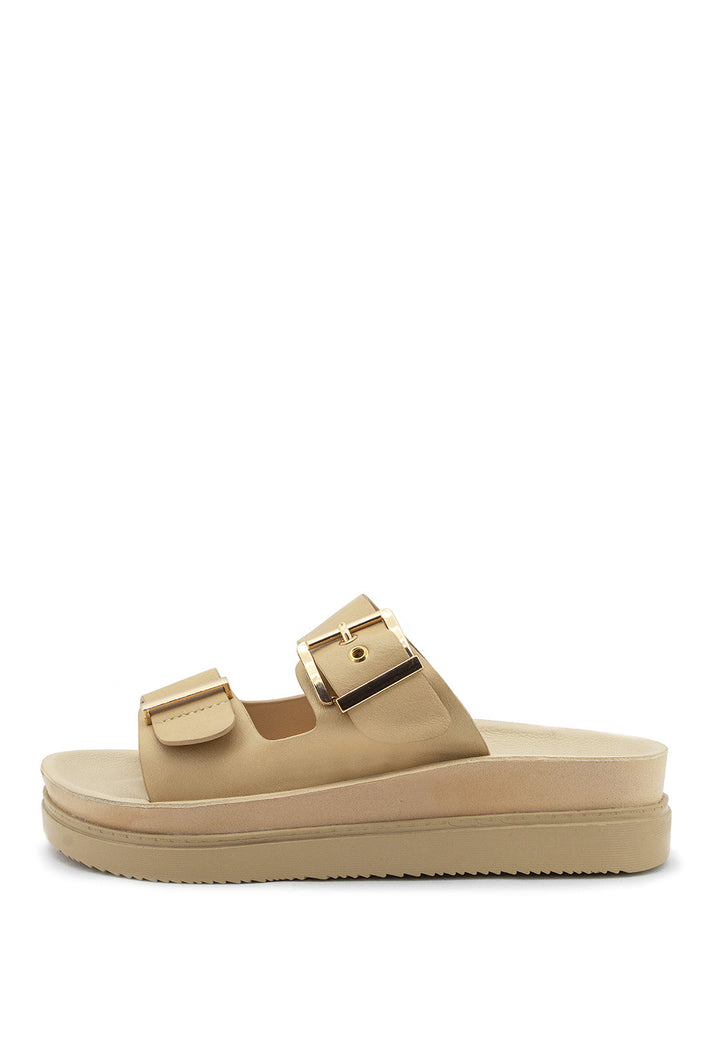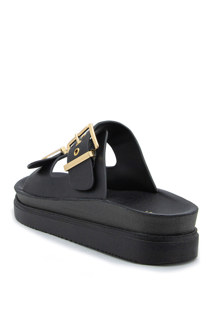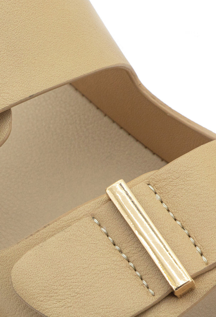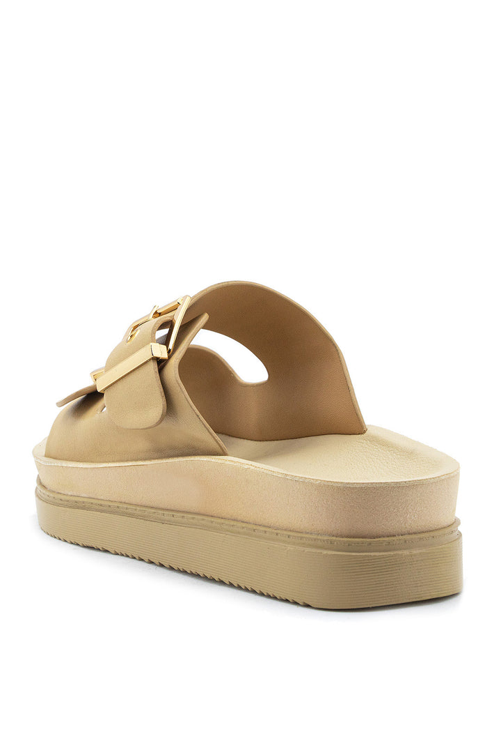 Sandalia plana que combina comodidad y elegancia con un diseño minimalista. Presenta una correa ajustable adornada con un accesorio metálico que añade un toque de sofisticación a tu look. Ideal para transiciones entre estaciones, esta pieza versátil se adapta tanto a outfits casuales como a conjuntos más refinados. La suela plana proporciona estabilidad y confort durante todo el día, mientras que el detalle metálico eleva cualquier atuendo con un acabado contemporáneo y chic.