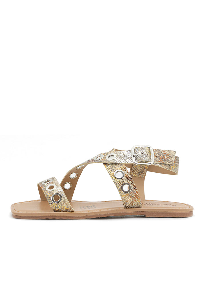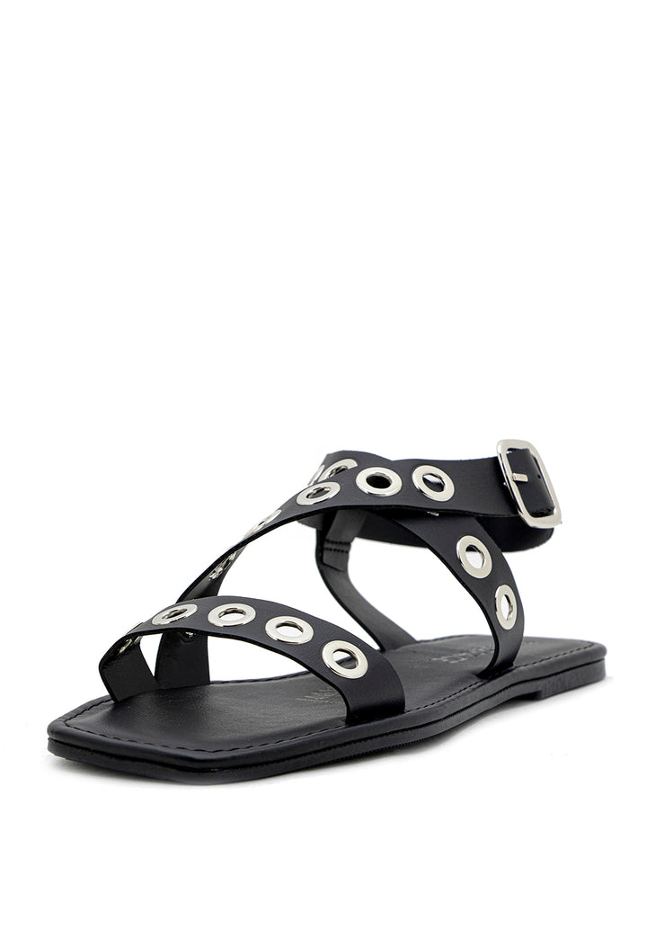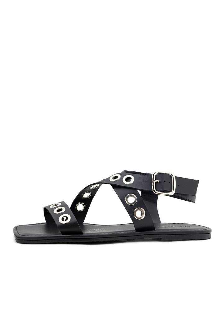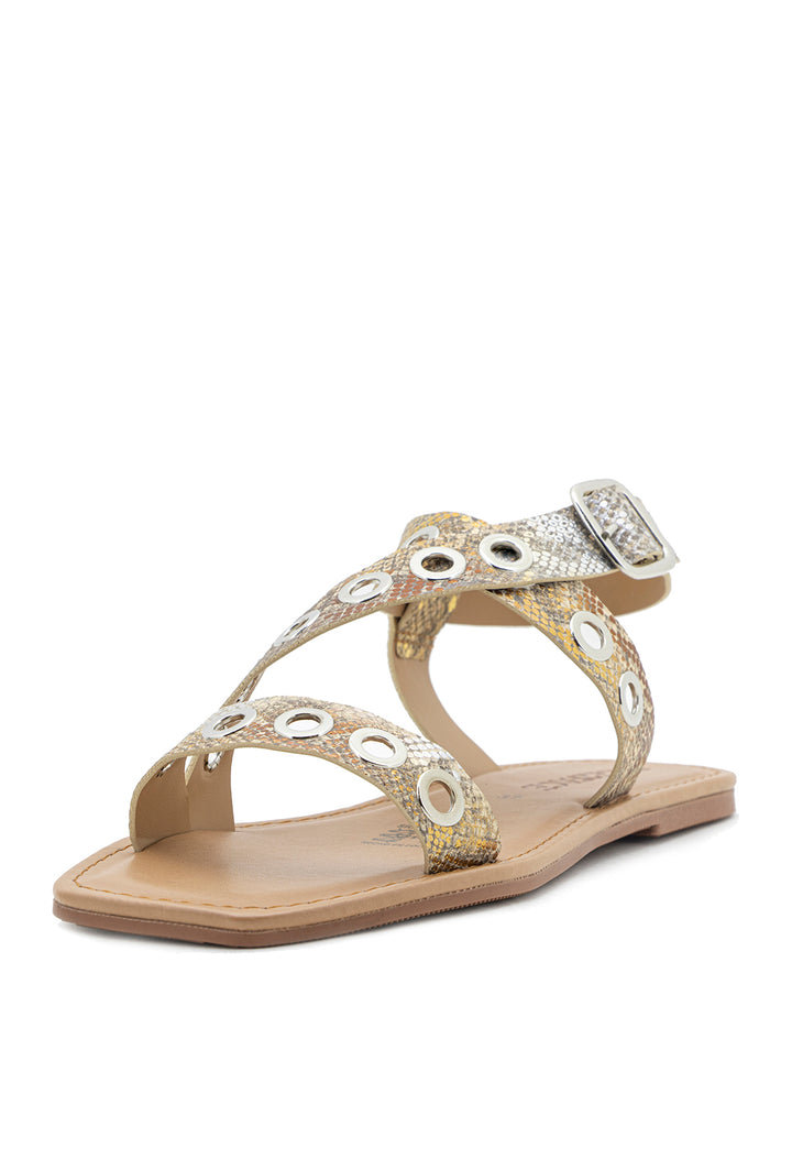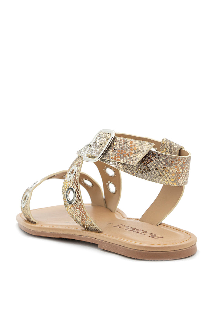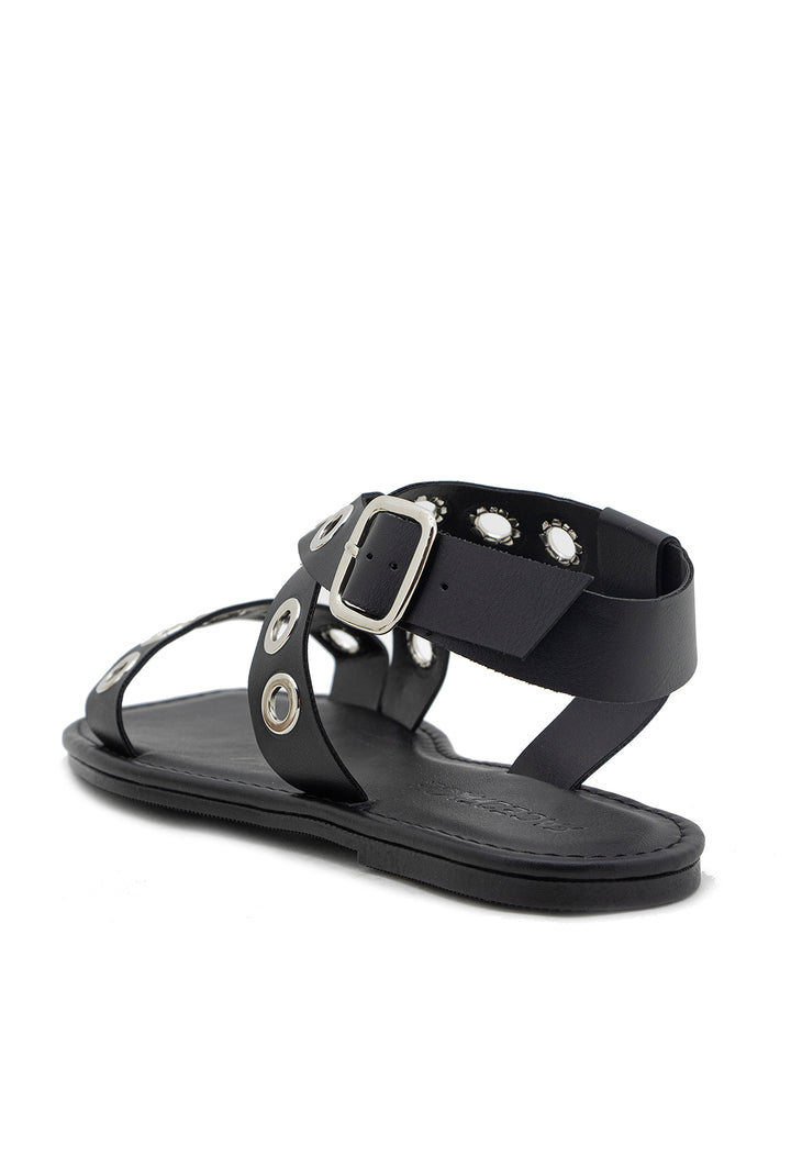 Sandalia plana con taches decorativos redondos, y hebilla lateral plateada