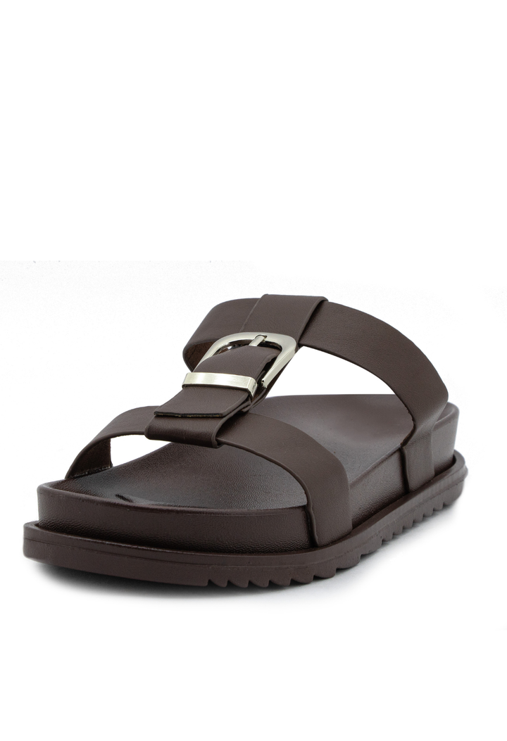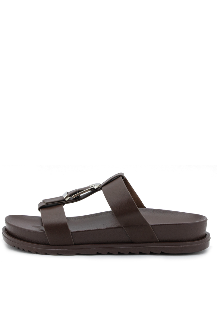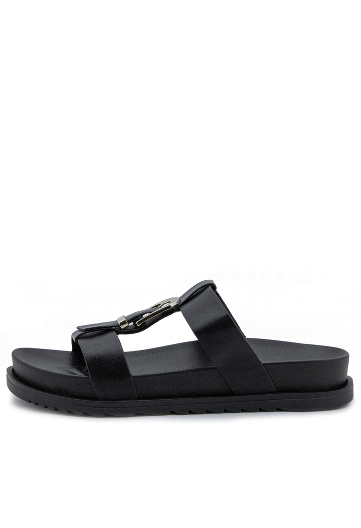 Sandalia plana de diseño minimalista que combina comodidad y elegancia. Presenta una suela ancha que proporciona estabilidad y soporte durante todo el día, mientras que sus correas ajustables con hebilla vertical ofrecen un cierre seguro y personalizable. Ideal para looks casuales o semi-formales, esta pieza versátil se adapta a cualquier ocasión, desde paseos urbanos hasta eventos relajados. Su estructura limpia y proporciones equilibradas la convierten en un básico imprescindible del guardarropa femenino moderno.