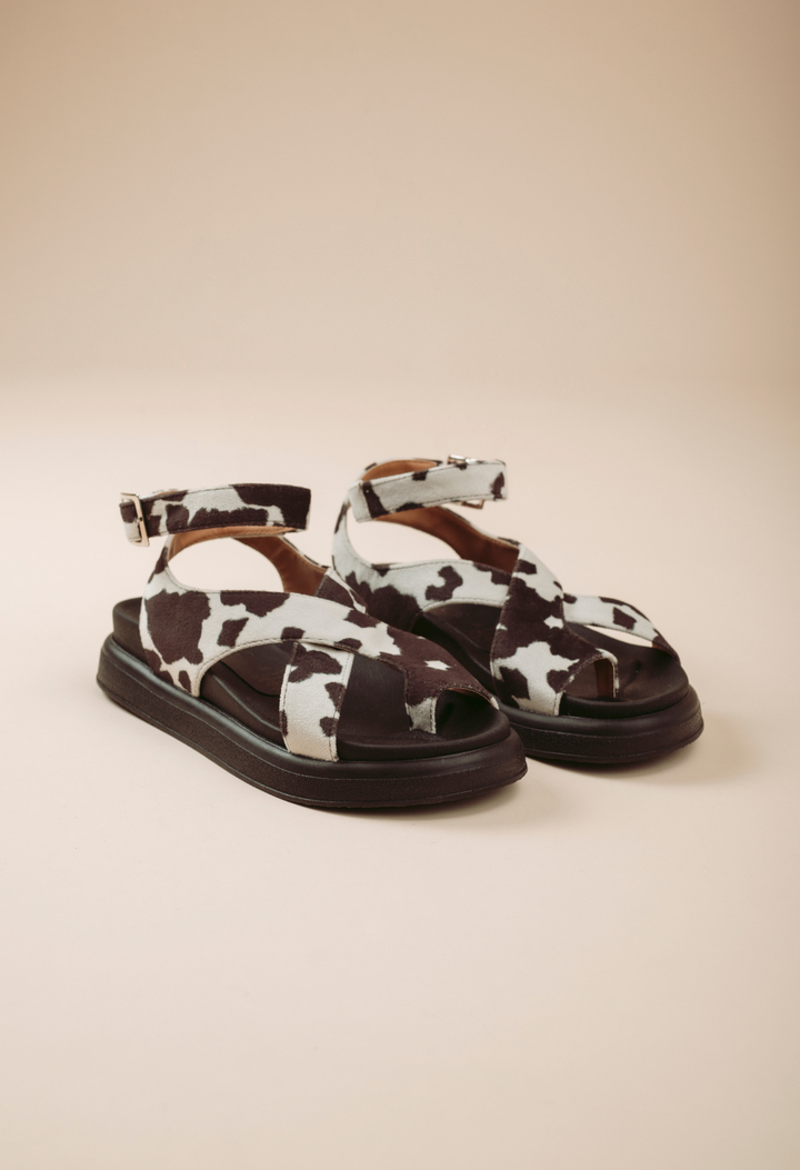 Descubra la perfecta fusión entre estilo y comodidad con esta sandalia plana de suela chunky. Su diseño envolvente y el sofisticado efecto cowprint aportan un toque moderno y elegante, ideal para realzar cualquier atuendo. La suela gruesa brinda estabilidad y soporte durante todo el día, haciendo de esta sandalia una opción versátil y chic para la mujer contemporánea.