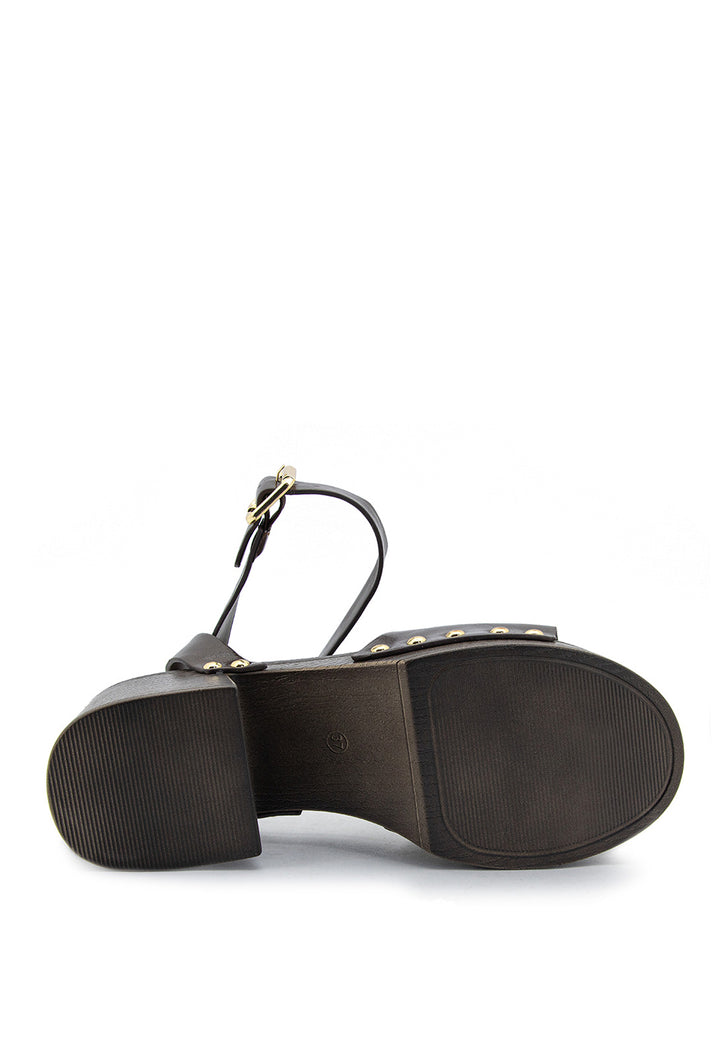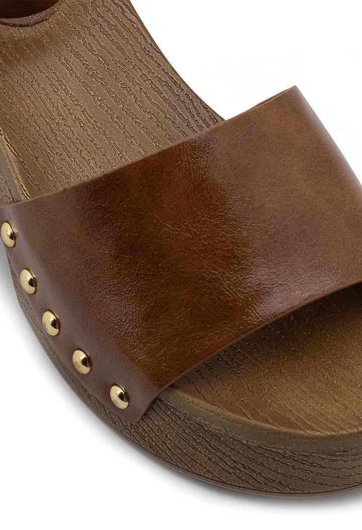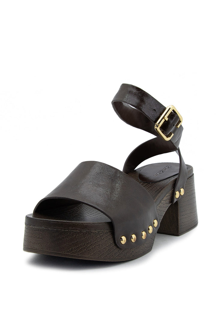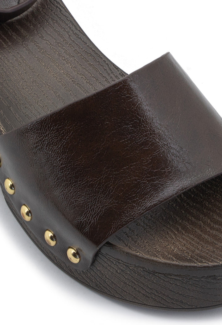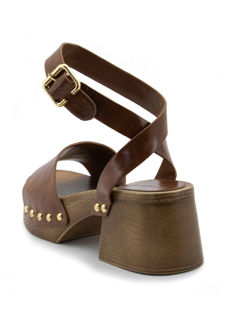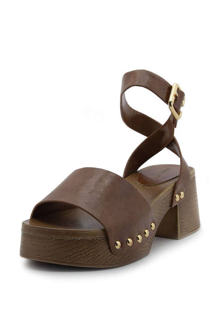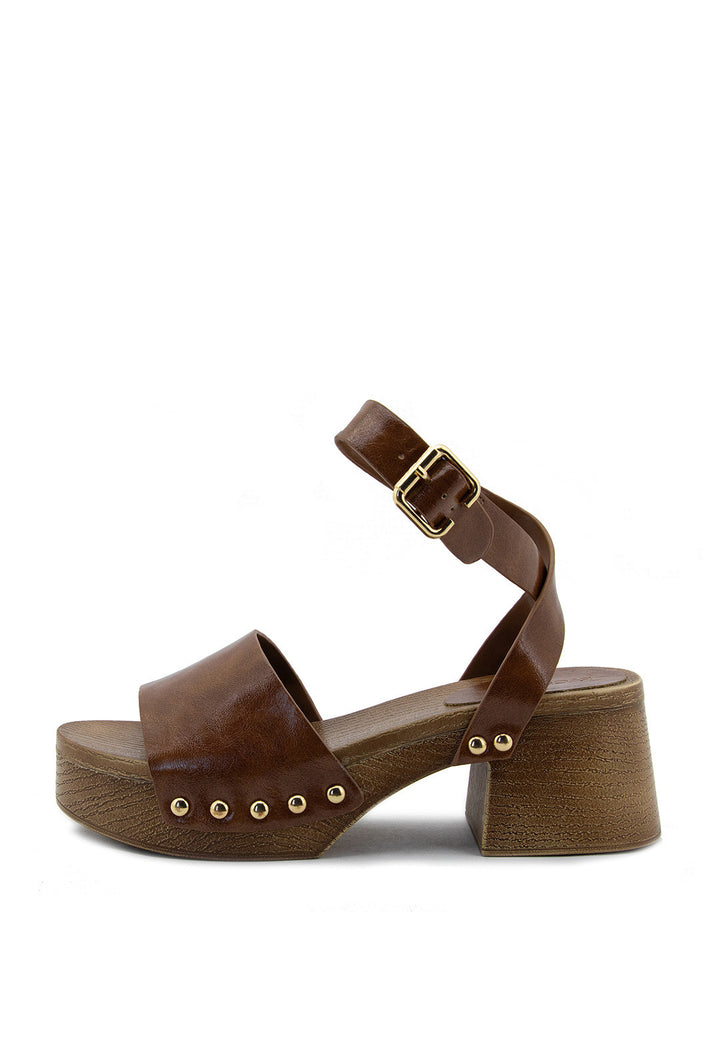 Tacón tipo madera con detalles de taches que combina elegancia clásica con un toque contemporáneo. Su plataforma proporciona comodidad y estabilidad, mientras que el acabado en madera natural aporta calidez y sofisticación a cualquier look. Ideal para quienes buscan un calzado versátil que transita sin esfuerzo de día a noche, elevando cada paso con estilo refinado y personalidad distintiva.